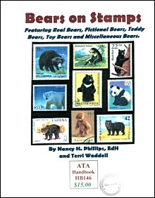 Bears on Stamps by Nancy H Phillips EdD and Tern Waddell. Published by the American Topical Association. 57 pages, perfect bound. A wide range of bears is featured in this book including American and Asiatic Black Bears, Grizzly, Sloth, Sun and the Spectacled Bear. Then there is information on the well known Polar Bear and the rare Panda. Photographs and checklists for each variety are provided, plus information to assist readers to understand the diets, habitats and characteristics of these large animals. Fictional bears are also listed including such well known characters as Rupert, Paddington and Baloo (from Jungle Book).