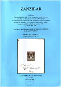 Zanzibar 1895-1904. The latest handbook of the East Africa Study Circle. 90 pages A4 card cover. This book comprises a reprint of Thomas William Hall’s treatise on Zanzibar which appeared in the Africa section of ‘Africa: Part III’ originally published by Stanley Gibbons for the Philatelic Society, London in 1906. The Royal Philatelic Society has given permission for the reprinting of this highly important work of Zanzibar research. Coupled with this is the 1947 paper entitled ‘Zanzibar: Some Spurious Varieties’ by Sir John Wilson, who was at that time Keeper of the Royal Collection and originally published in ‘The Philatelist’. This appears as Appendix I, while Appendix II by Join Minns FRPSL covers additional research, which brings the study up-to-date. Richard Knight